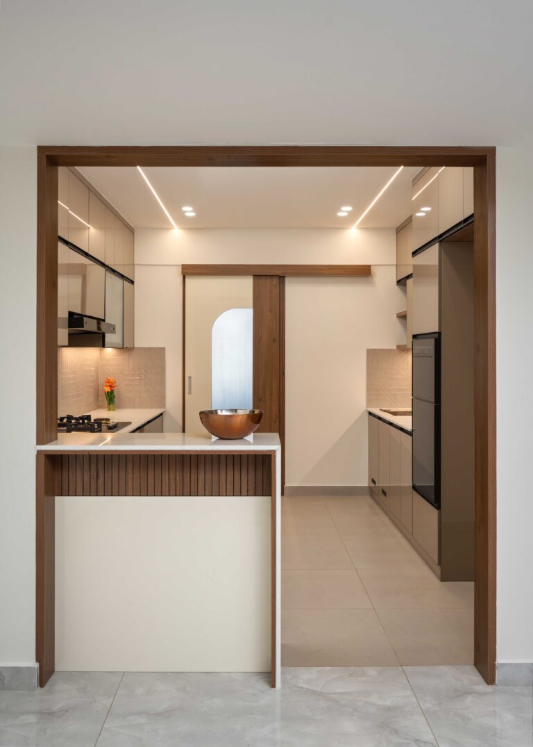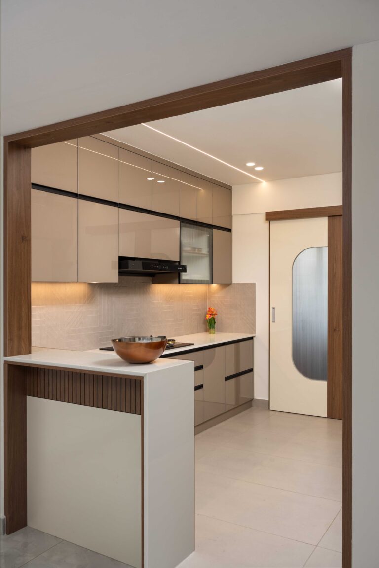 Bare kitchen with one inlet point each for sink, water purifier and dishwasher. Provision for washing machine and dryer in utility.